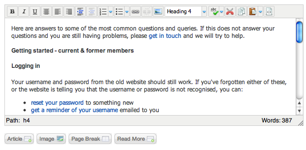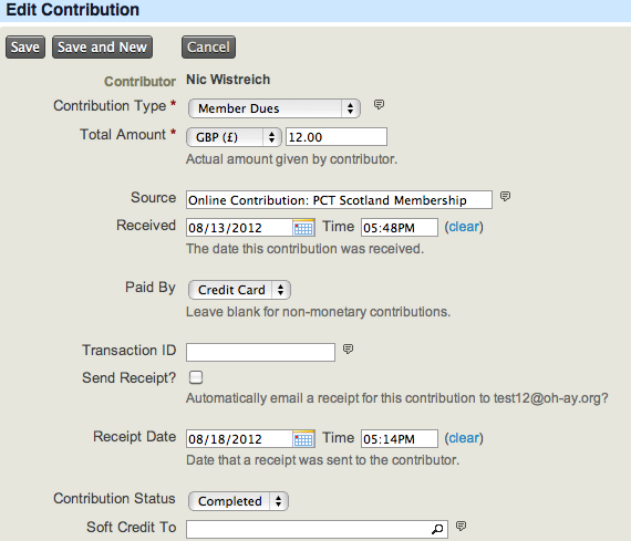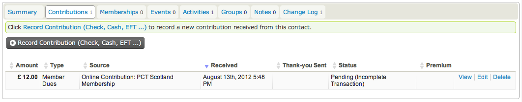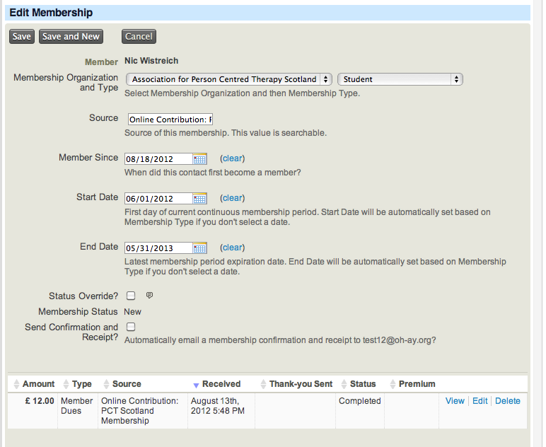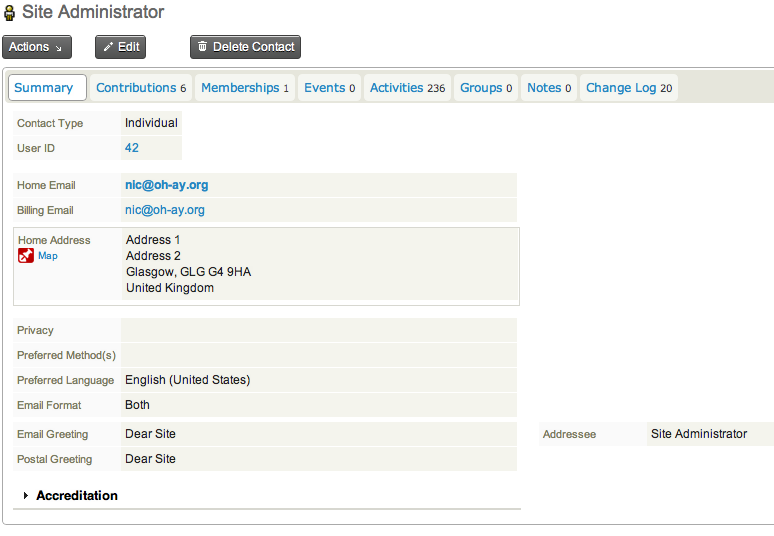 On the user’s record you can view (by clicking on the tabs) membership and payment history (called ‘Contributions’), notes and contact details. Clicking the ‘Accreditation’ word at the bottom will reveal their accreditation details provided at sign-up – and if they wish to appear in the directory or receive the newsletter. By clicking on the ‘Actions’ button, you can send an email, record a note, print a letter. By clicking the ‘Edit’ button, you can edit any of the details for this member (including opting them out of newsletters and the member directory. You can of course also Delete the member. The only thing this record doesn’t contain is their login password and access level (ie if they are a website administrator).
