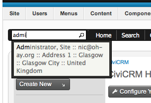 This loads up CiviCRM. If you are looking for details on a member, begin to type part of their name in the search box in the left hand corner. After a few seconds this will bring up suggested contacts – click on the one you want and this user’s full record will load.